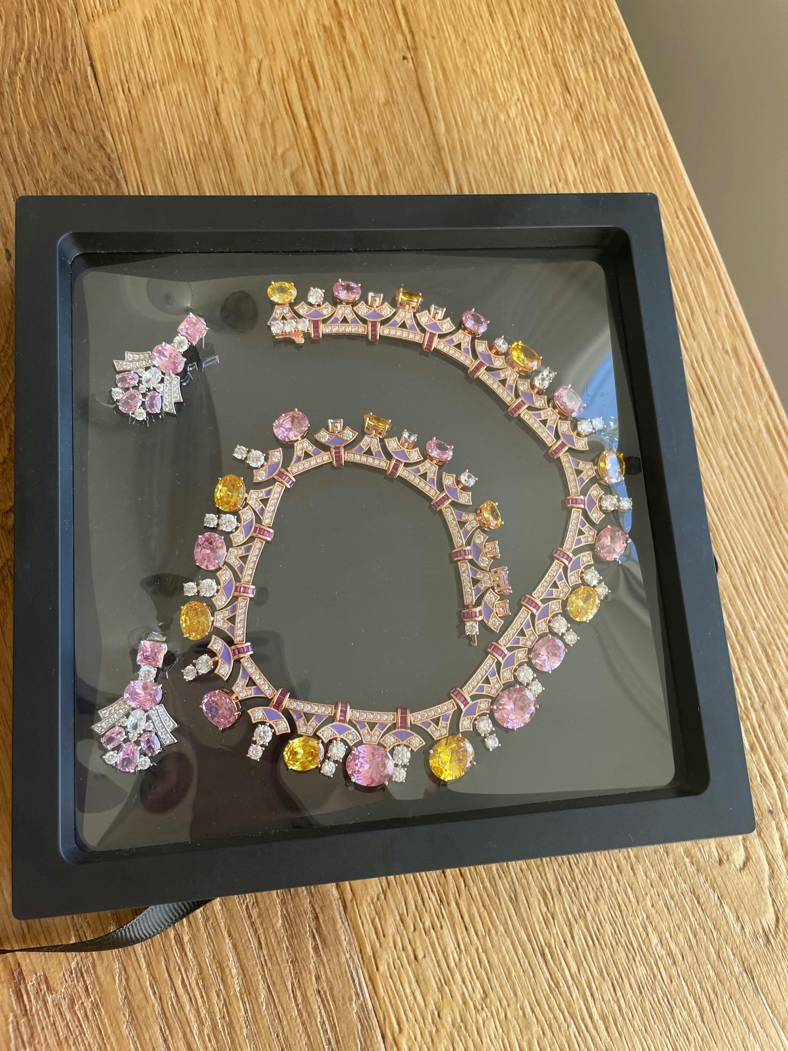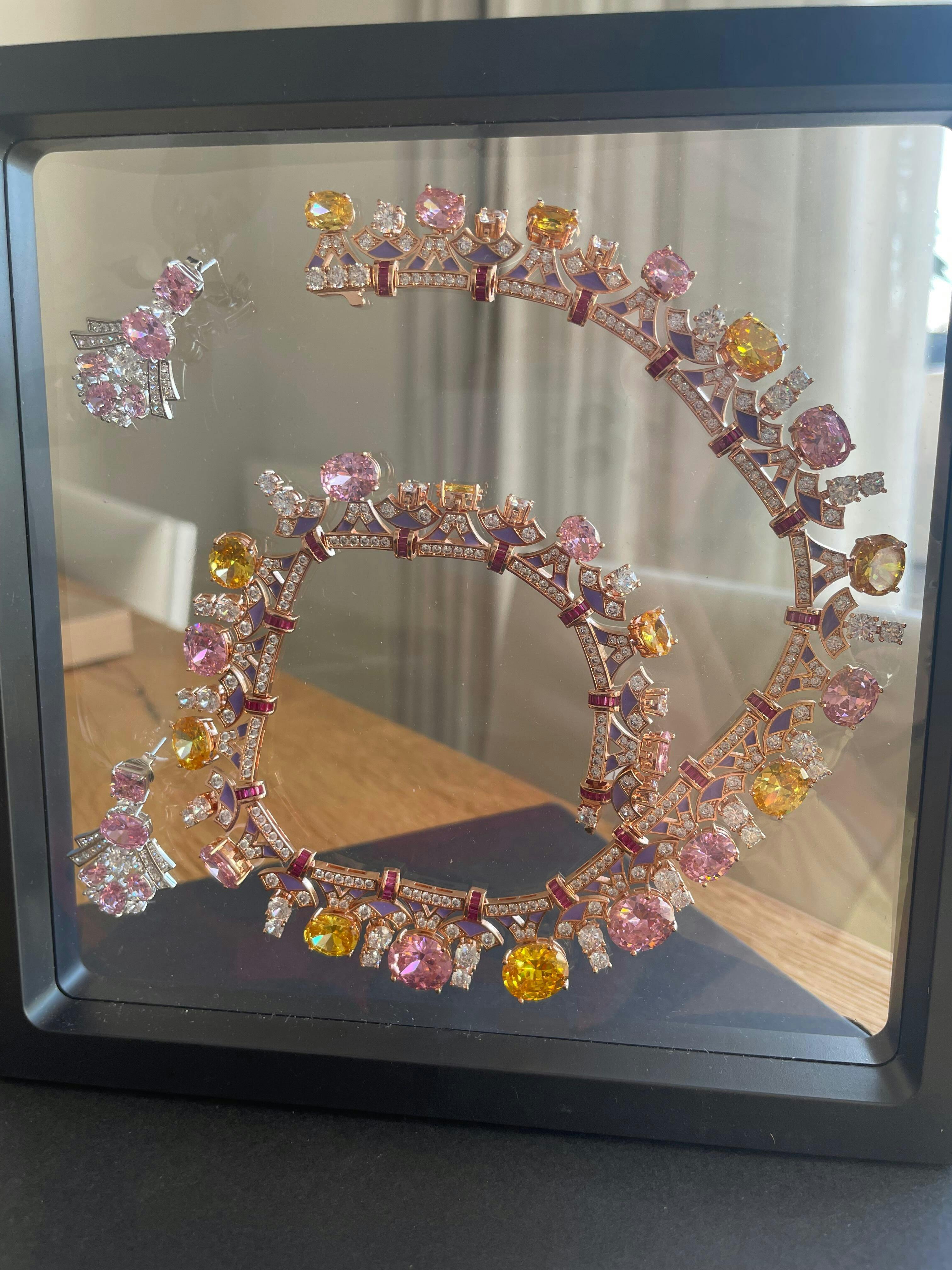 This necklace blooms like a royal fresco—every curve, every petal, and every shade is crafted to feel both majestic and tender. Oval-cut diamond simulants in soft pastels glow against hand-painted enamel, forming a symphony of color that moves with you. Whether catching the sun at a garden party or elevating a winter dress, it is a blossom that doesn’t wilt—it simply chooses a different stage each day.